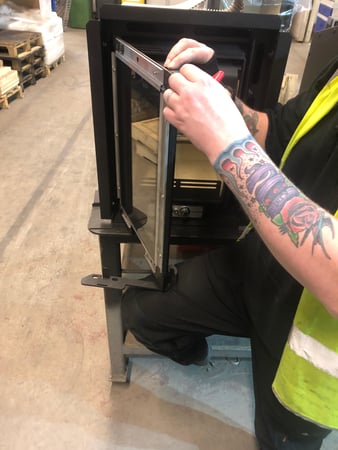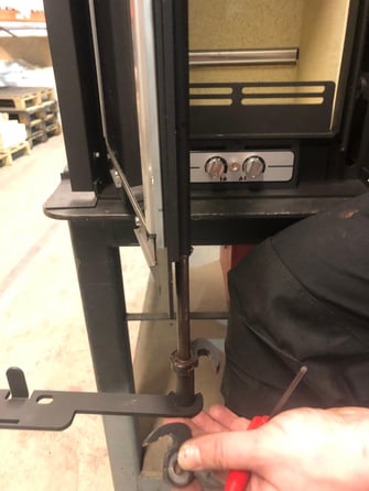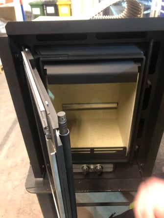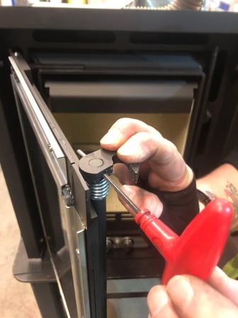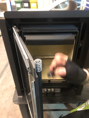 If you then do this in reverse you will then be able to place the pin back in, there is no tool in order to do this. The facia would then be able to be bolted back onto the stove once this has been done.